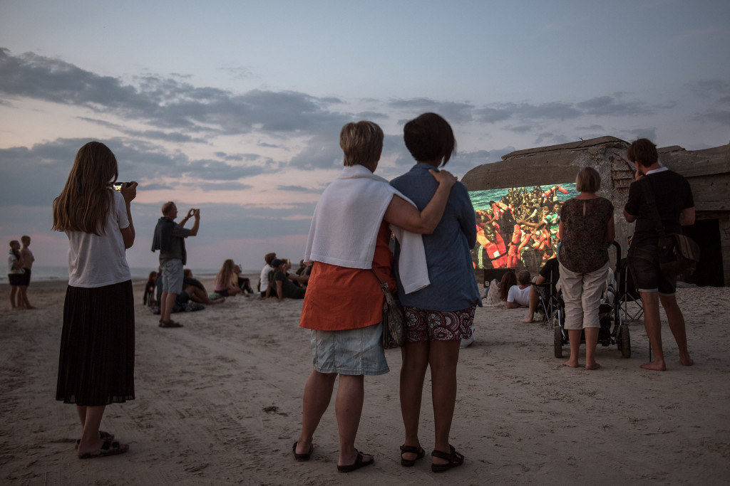 Nedenfor ses et billede fra et arrangement i sommers, hvor Pixlart projekterede Jacob Ehrbahns billeder af folk på flugt på Middelhavet op på gamle bunkere ved Vesterhavet.